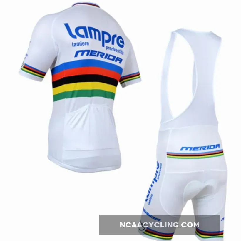 This is the 2013 World Road Champion cycling set worn by Portuguese rider Rui Costa with the Italian Lampre-Merida team. This beautiful white outfit with the rainbow jersey will bring him luck as he wins the Tour de Suisse and finishes 2nd in Paris-Nice.