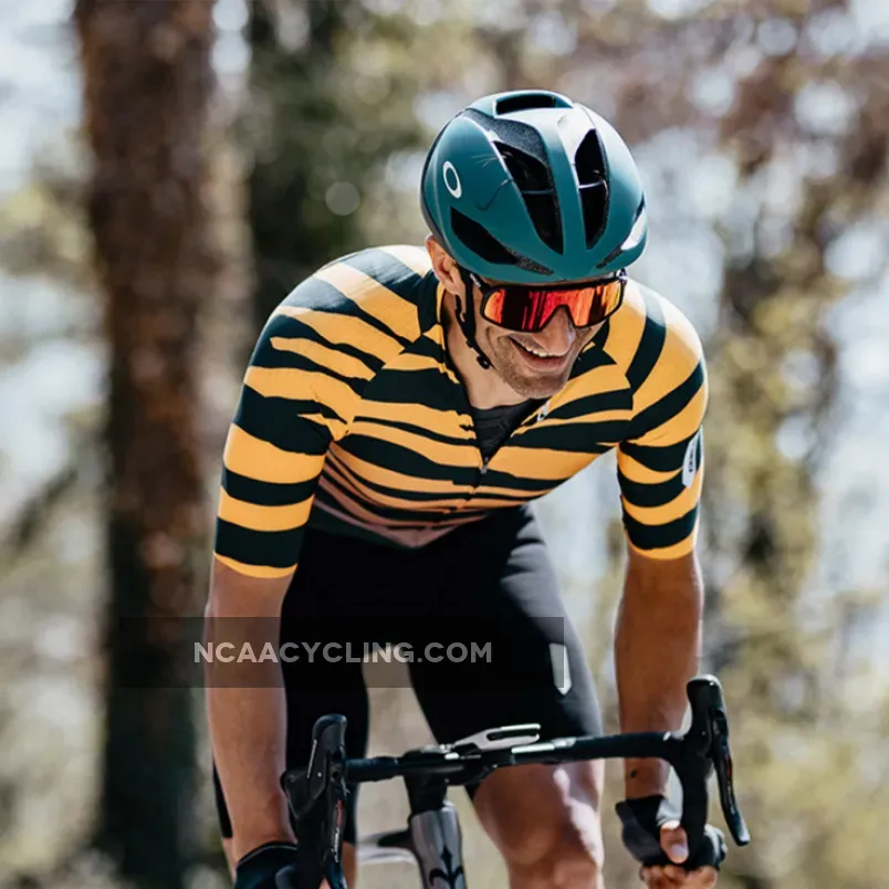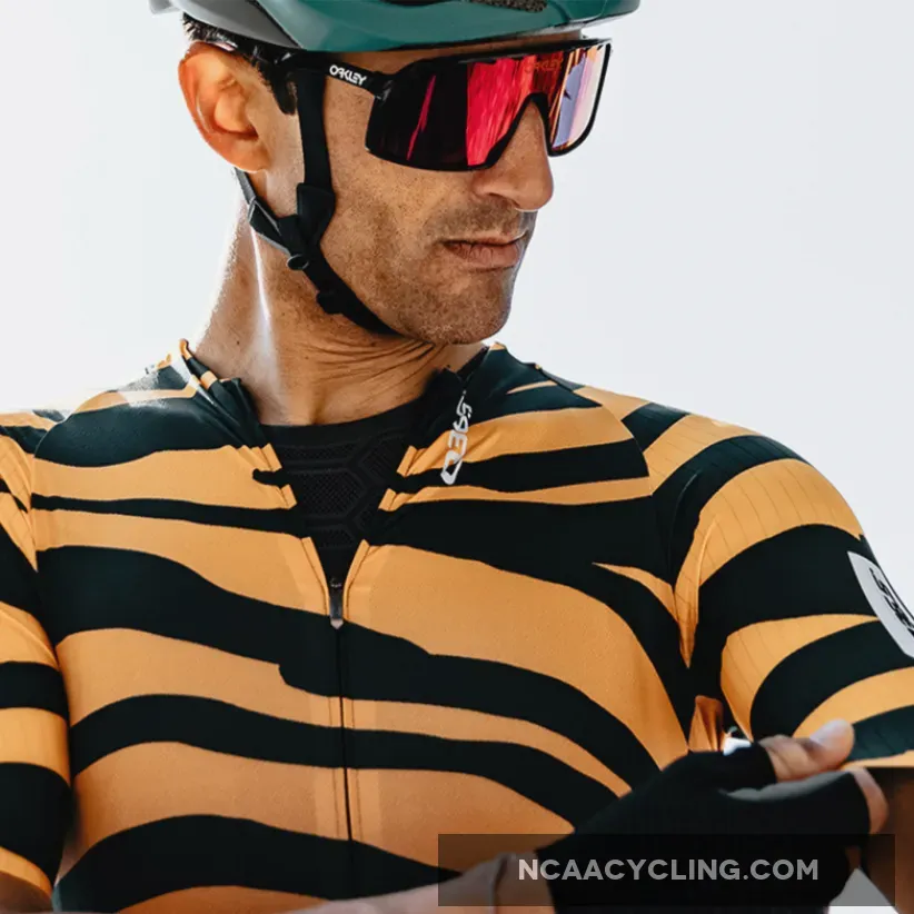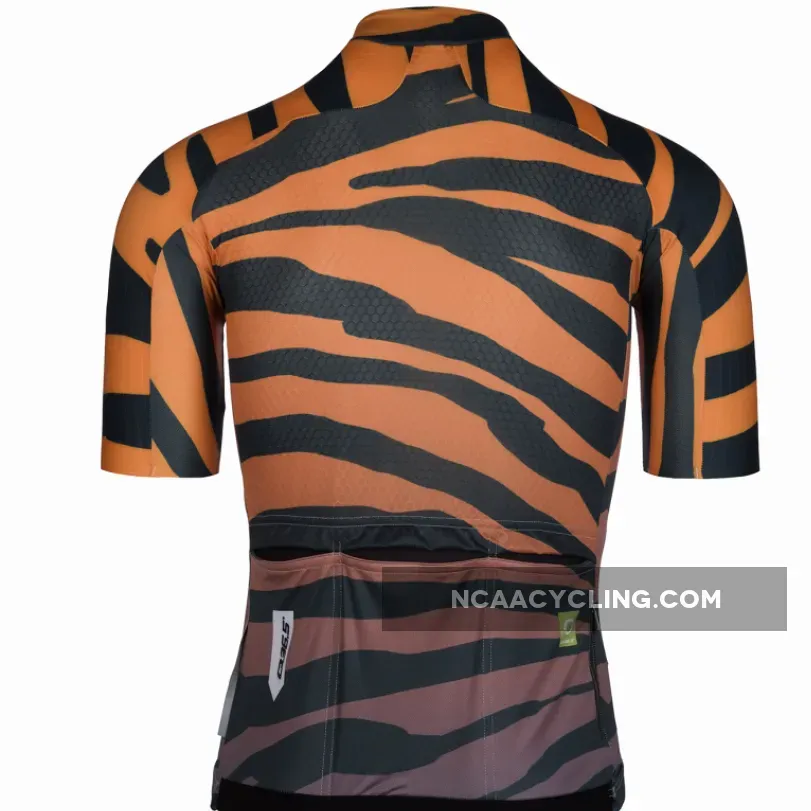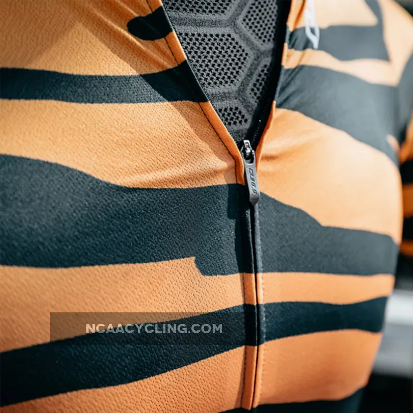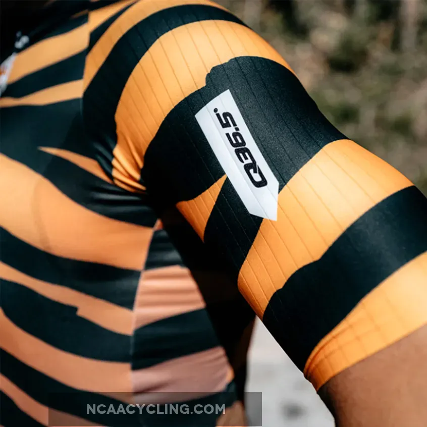 Q36.5 R2 Tiger jersey, Q36.5 designed a new Raglan shirt, updating the raglan cut used for a long time in traditional cycling links. After careful studies both in the field of body mapping and aerodynamics, the new Raglan R2 was designed using a combination of different tissues strategically positioned with consequent new look and offering all the advantages of detailed search. The sleeves are made with a aerodynamic ribbed fabric while the front panel is a microphorated fabric and on the back of the shirt there is a honeycomb fabric. Overall, this innovative combination makes the R2 shirt very light (110gr) and very breathable. Historical note: the construction of the Raglan sleeve appeared for the first time on the cycling scene in 1986, when the Dutch PDM team introduced this new cut for reasons of brand visibility; The large PDM logo was extremely visible on the larger sleeve. This was the beginning of the popularity of this mesh style.
